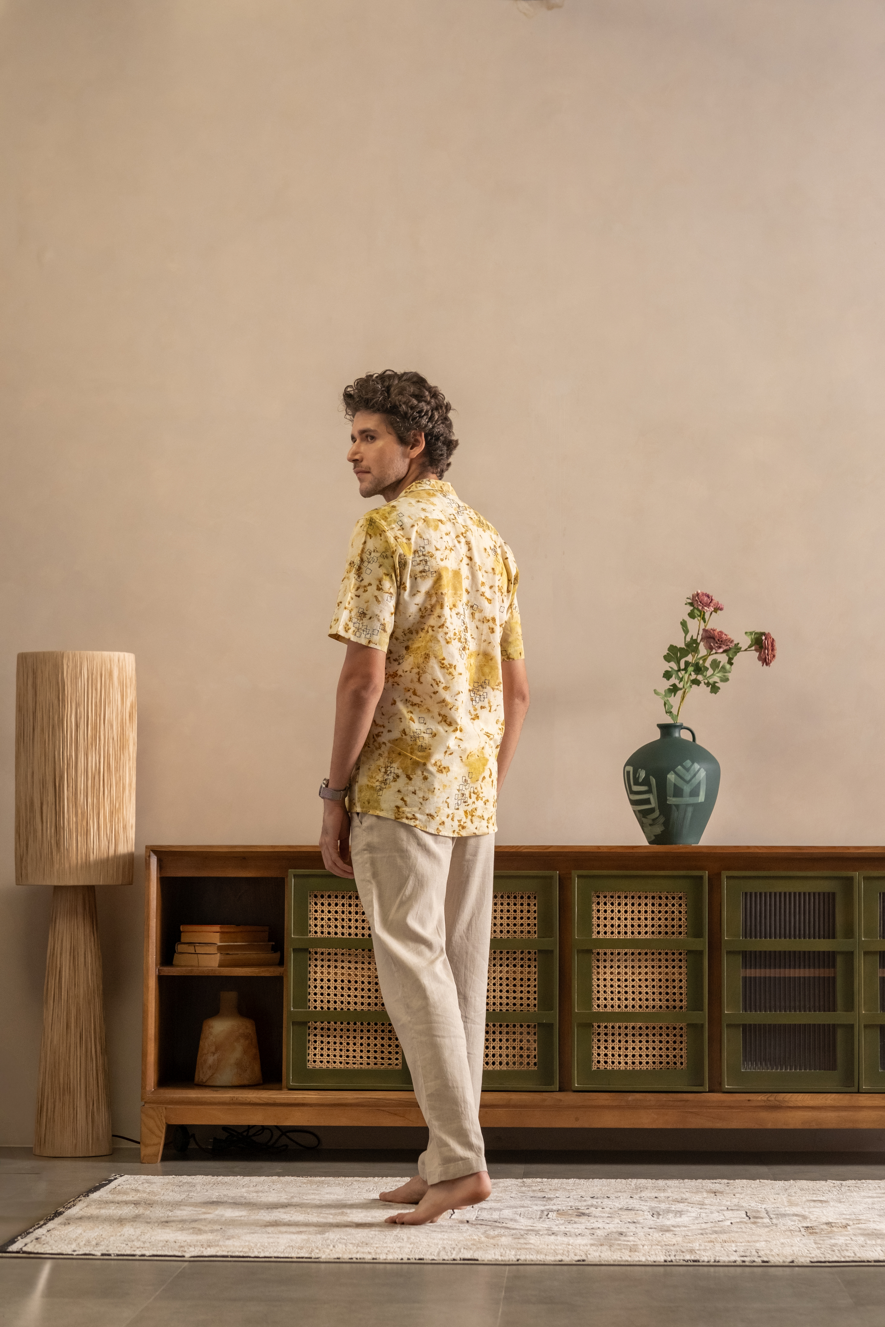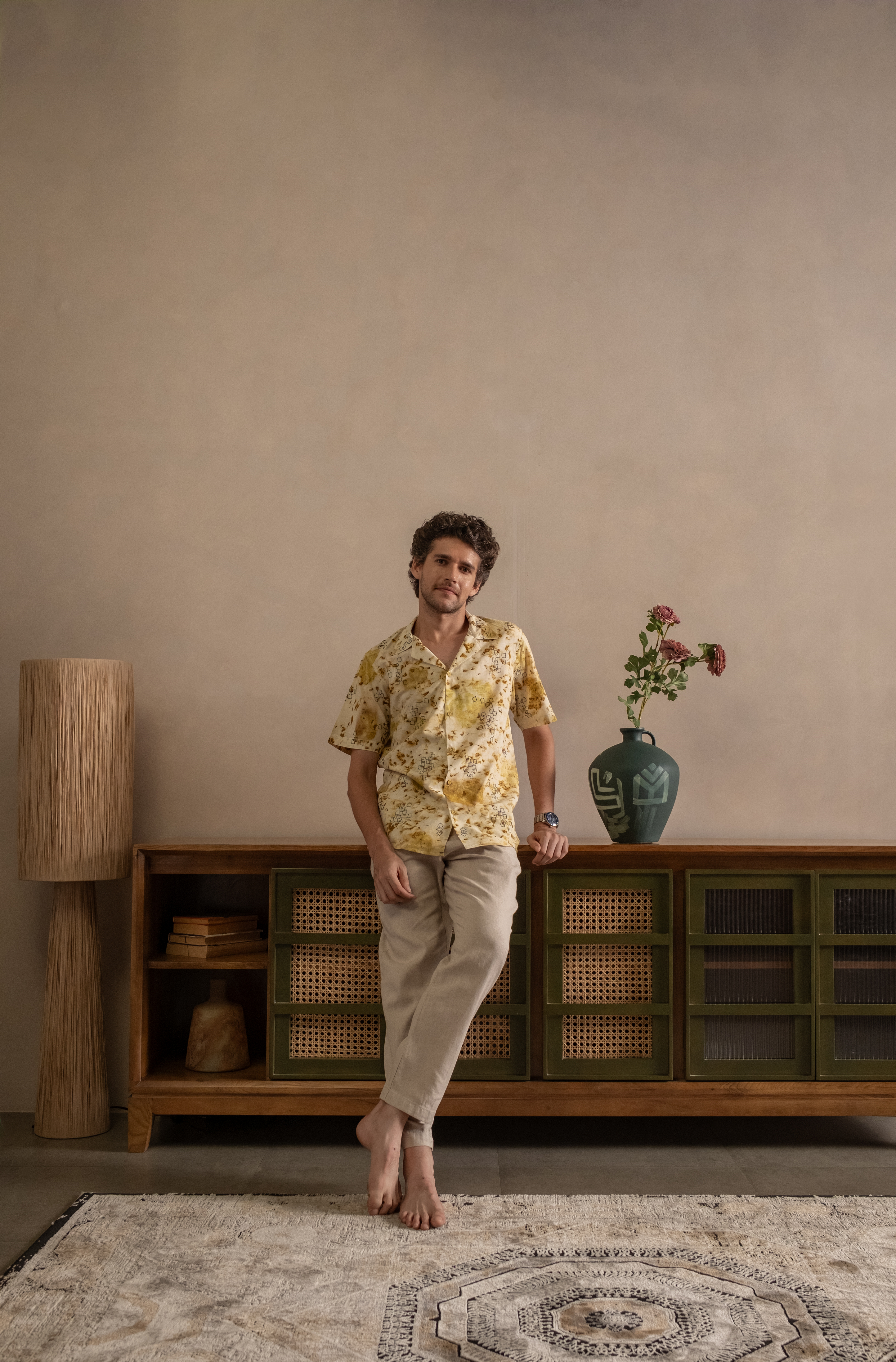 This creation is handwoven in premium Khadi, blending sustainable craftsmanship with refined artistry. The shirt features nature-inspired eco prints, achieved through a botanical dyeing process that transfers the delicate impressions of leaves and flowers directly onto the fabric. Enhanced with intricate hand embroidery, it embodies timeless elegance with a conscious approach to luxury.