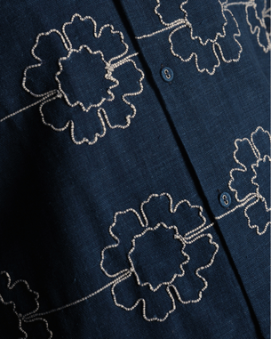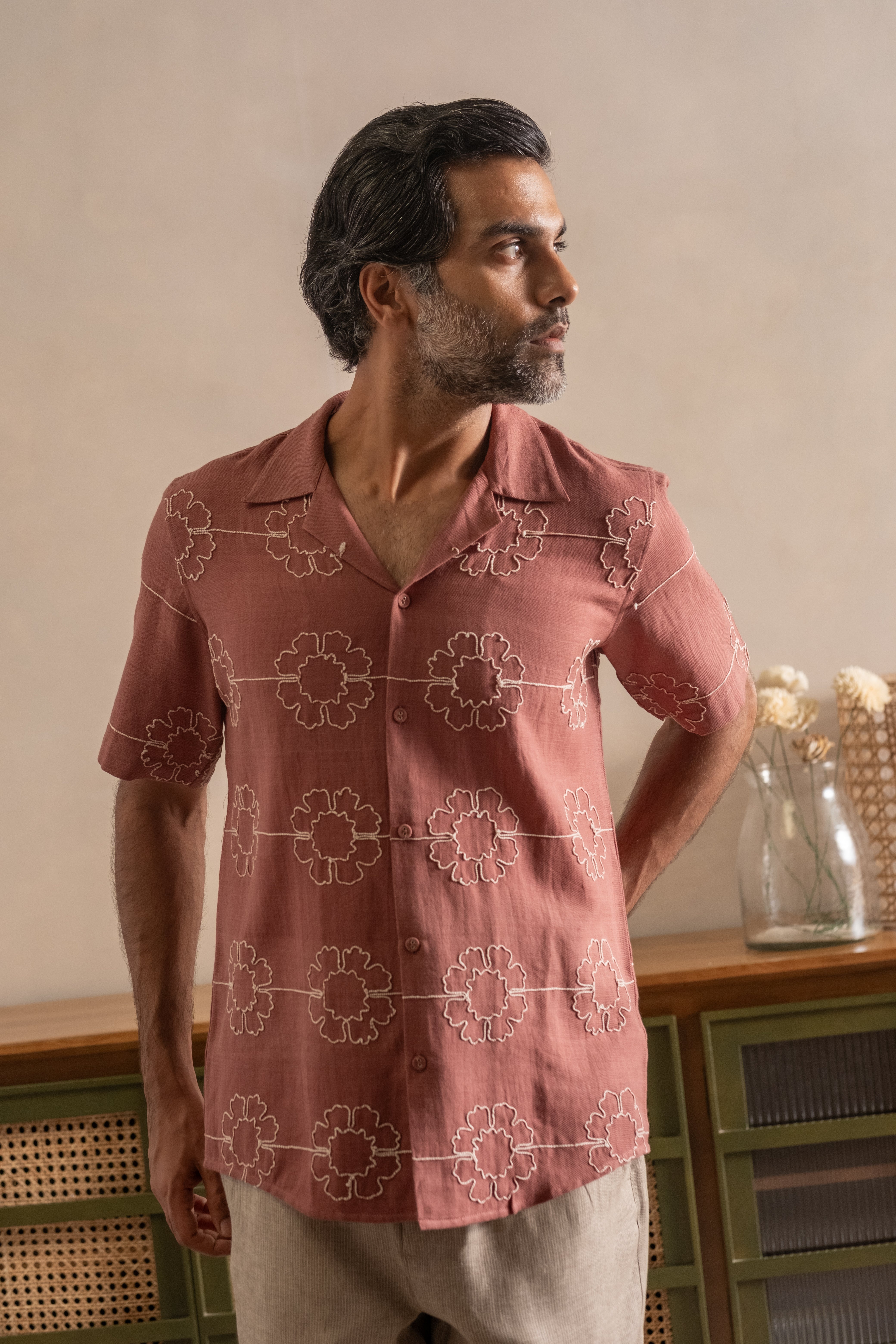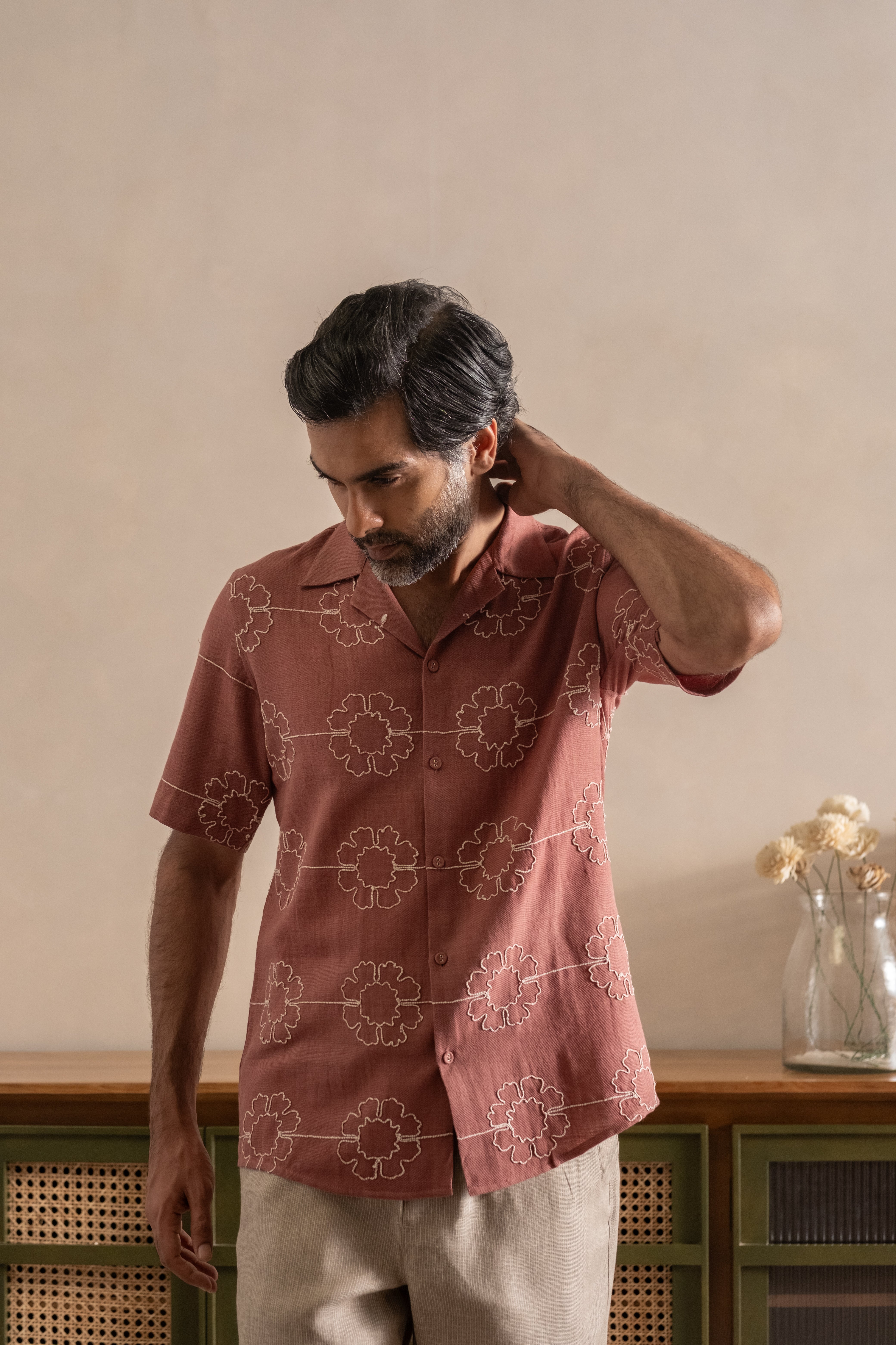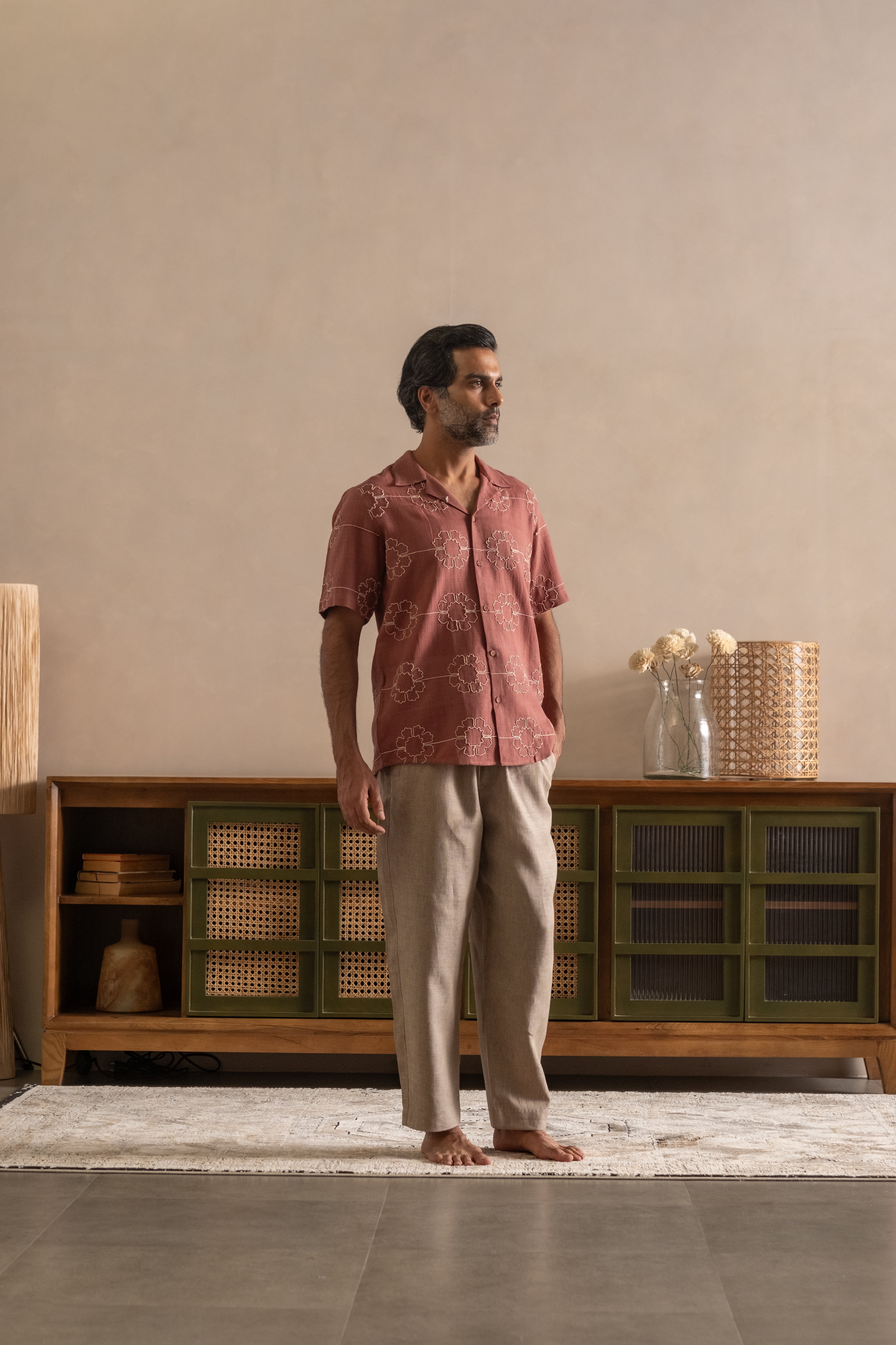 Expertly tailored from handwoven pure cotton, this shirt is presented in a natural Madder Root hue a deep, earthy red born from the roots of the Rubia plant, cherished for centuries for its richness and permanence. Accentuated with contemporary embroidery, each motif is executed with artisanal precision, striking a balance between modern elegance and timeless craft.