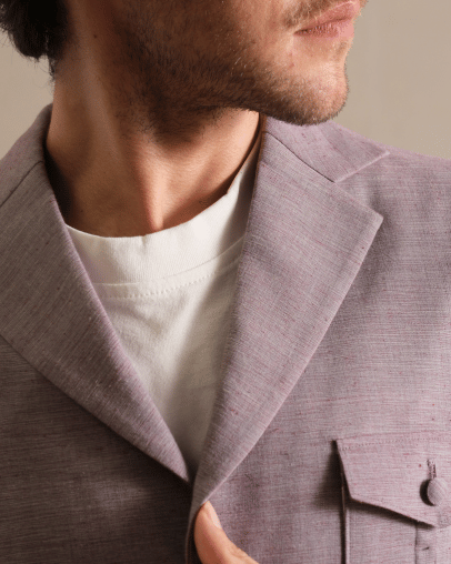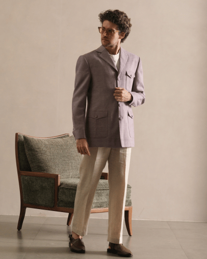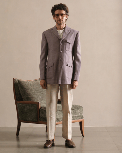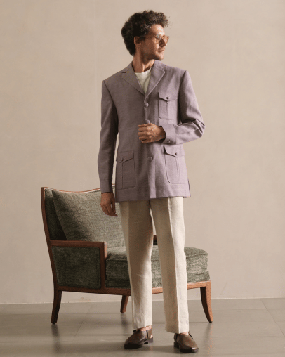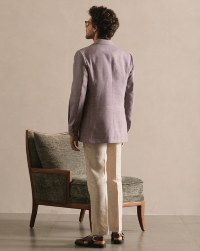 Crafted from premium two-ply cotton, this blazer embodies refined tailoring and understated luxury. The fabric’s natural breathability and smooth texture ensure superior comfort, while its structured drape delivers a sharp, polished silhouette.