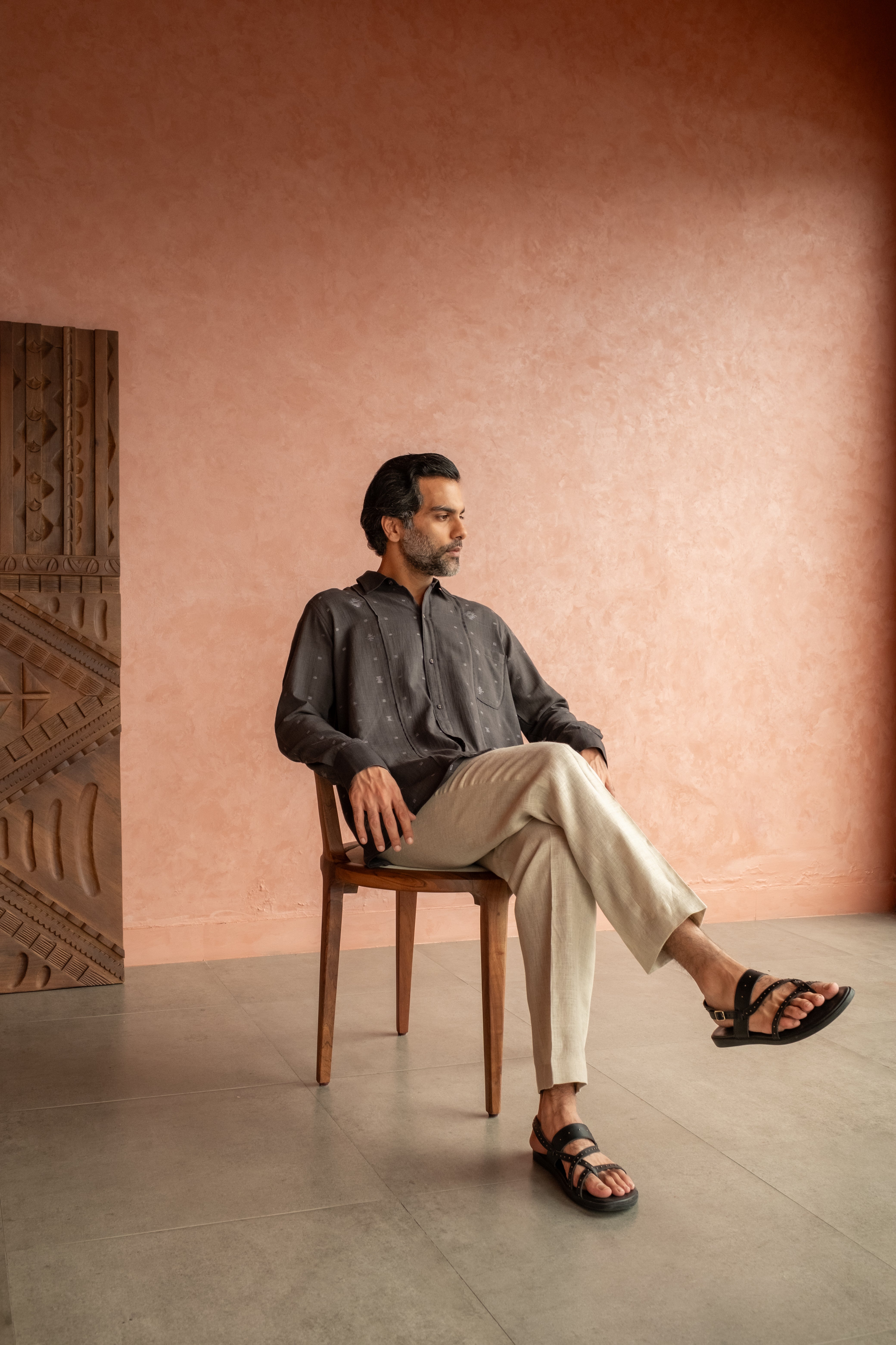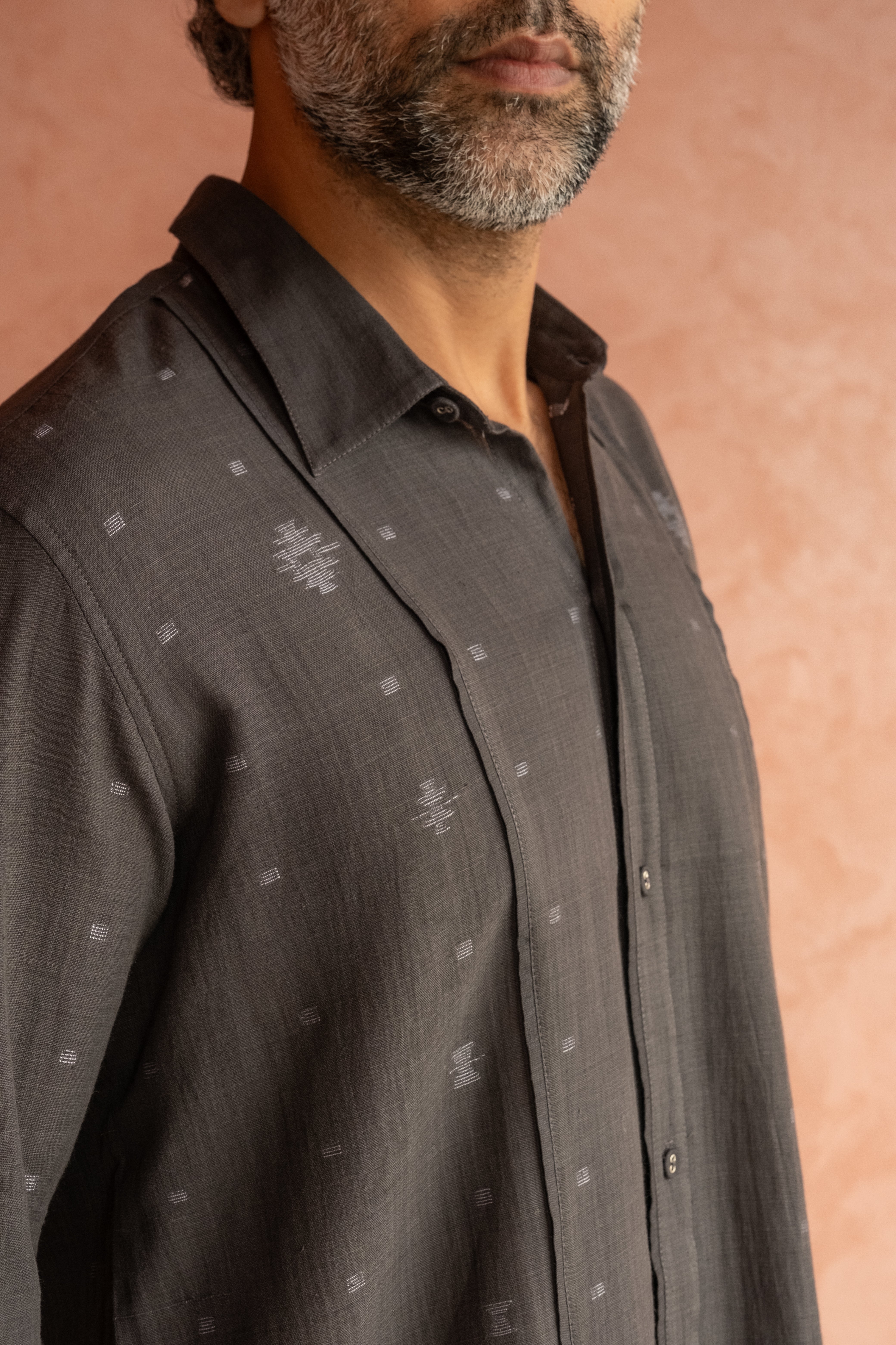 Presented in a natural black hue, the piece is achieved through a traditional dye process using organic Haritaki, which enhances its depth and character.