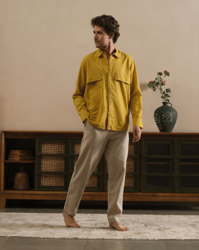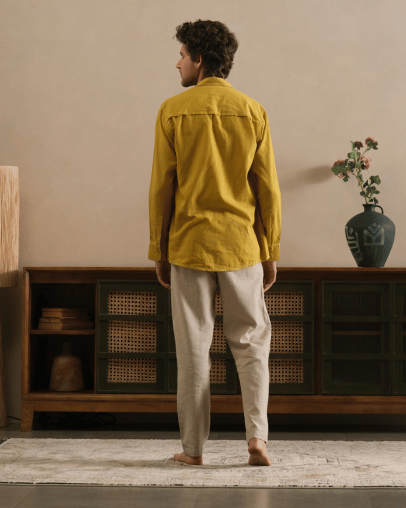 Presented in a radiant Marigold Yellow hue, the colour is derived from a traditional natural dye process using marigold flowers, offering a shade that is both vibrant and timeless.